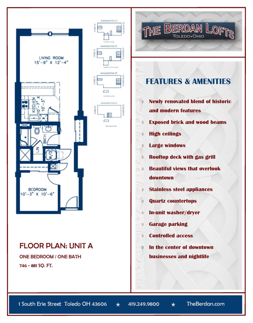 Our homes features a unique, open floor plan, rich with historical appeal including exposed brick walls, ductwork, timber columns and beams with cast iron, 14' wood ceilings. and large windows offering superb natural light. The Berdan is perfectly situated in the heart of downtown Toledo's Historic Warehouse District, across the street from the home plate entrance to Fifth Third Field, convenient to the Business District, and within walking distance of numerous retail, dining, parks and recreation, major businesses and employers, medical facilities, and entertainment venues including Hensville, the Maumee River, Middle Grounds Metropark, Huntington Center, Promenade Park, Toledo’s Farmers Market on Erie Street, and Seagate Convention Center. Modern elegance, comforts, and conveniences abound with quartz countertops, stainless steel appliances, central heat/air, soft close maple cabinetry, ample closet space, in-unit washer and dryer, quality finishes, and attention to detail throughout. Residents can enjoy relaxing in a chaise lounge on the rooftop deck, cooking on the grill, cheering on the Mudhens, and taking in the panoramic views of downtown.