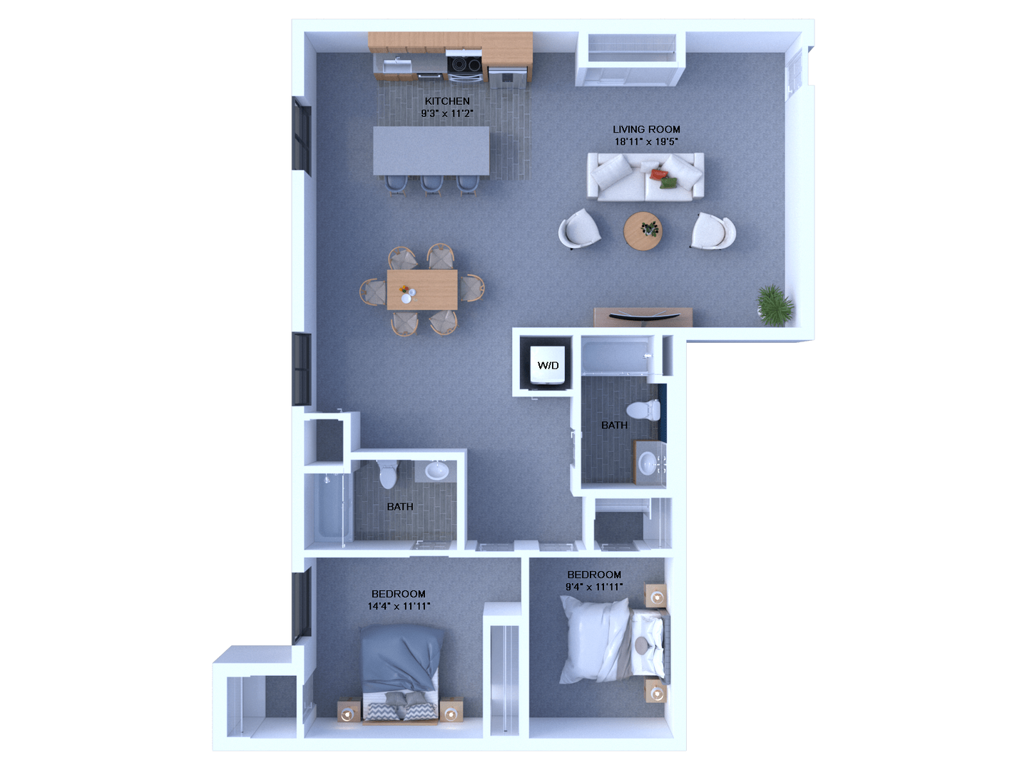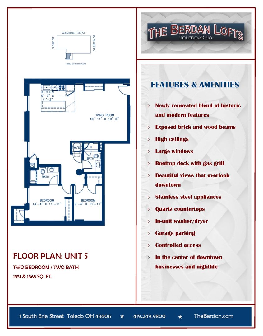 Our 2-bedroom / 2-bath apartment home features a unique, open floor plan, rich with historical appeal including exposed brick walls, ductwork, timber columns and beams with cast iron, 14' wood ceilings. and large windows offering superb natural light. The Berdan is perfectly situated in the heart of downtown Toledo's Historic Warehouse District, across the street from the home plate entrance to Fifth Third Field, convenient to the Business District, and within walking distance of numerous retail, dining, parks and recreation, major businesses and employers, medical facilities, and entertainment venues including Hensville, the Maumee River, Middle Grounds Metropark, Huntington Center, Promenade Park, Toledo’s Farmers Market on Erie Street, and Seagate Convention Center. Modern elegance, comforts, and conveniences abound with quartz countertops, stainless steel appliances, central heat/air, soft close maple cabinetry, ample closet space, in-unit washer and dryer, quality finishes, and attention to detail throughout. Residents can enjoy relaxing in a chaise lounge on the rooftop deck, cooking on the grill, cheering on the Mudhens, and taking in the panoramic views of downtown.